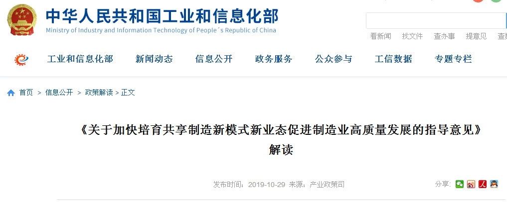 2019年10月22日,工業(yè)和信息化部印發(fā)了《關(guān)于加快培育共享制造新模式新業(yè)態(tài)促進制造業(yè)高質(zhì)量發(fā)展的指導(dǎo)意見》(工信部產(chǎn)業(yè)〔2019〕226號)(下稱《指導(dǎo)意見》)。現(xiàn)就《指導(dǎo)意見》有關(guān)內(nèi)容解讀如下: