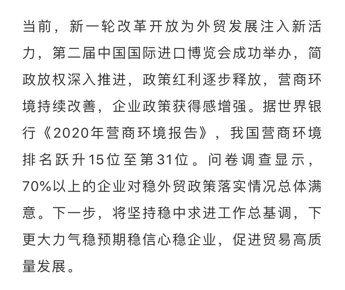 黨中央、國(guó)務(wù)院高度重視外貿(mào)工作。10月23日,李克強(qiáng)總理主持召開國(guó)務(wù)院常務(wù)會(huì)議,部署進(jìn)一步做好穩(wěn)外貿(mào)工作,推動(dòng)進(jìn)出口穩(wěn)中提質(zhì)。面對(duì)復(fù)雜嚴(yán)峻的外貿(mào)發(fā)展環(huán)境,商務(wù)部堅(jiān)決貫徹黨中央、國(guó)務(wù)院決策部署,扎實(shí)做好“穩(wěn)外貿(mào)”工作,大力推動(dòng)國(guó)際市場(chǎng)布局、國(guó)內(nèi)區(qū)域布局、商品結(jié)構(gòu)、經(jīng)營(yíng)主體和貿(mào)易方式等“五個(gè)優(yōu)化”,持續(xù)推進(jìn)外貿(mào)轉(zhuǎn)型升級(jí)基地、國(guó)際營(yíng)銷網(wǎng)絡(luò)和貿(mào)易促進(jìn)平臺(tái)等“三項(xiàng)建設(shè)”,積極推進(jìn)貿(mào)易高質(zhì)量發(fā)展,各項(xiàng)工作取得積極成效,1-10月外貿(mào)發(fā)展穩(wěn)中提質(zhì)。