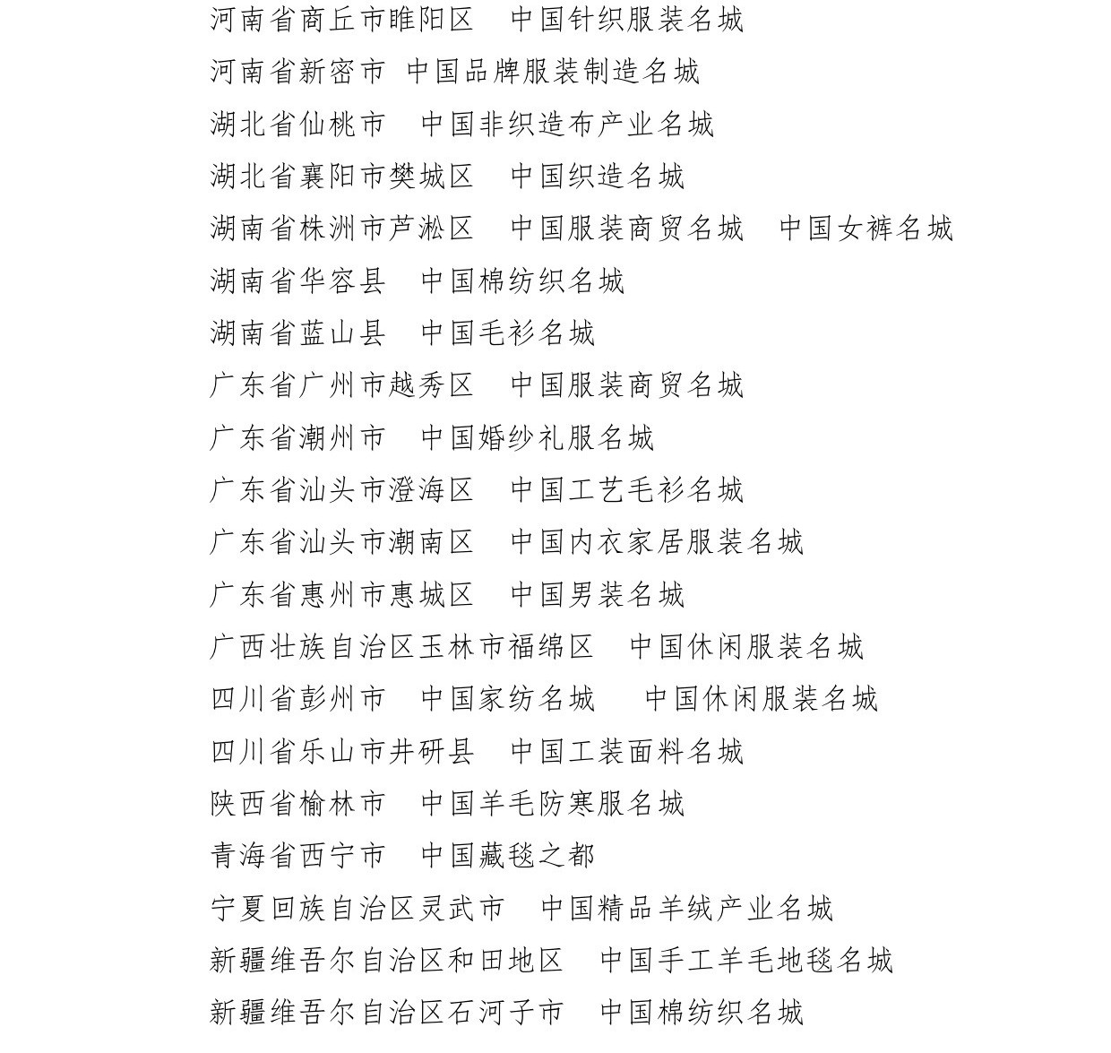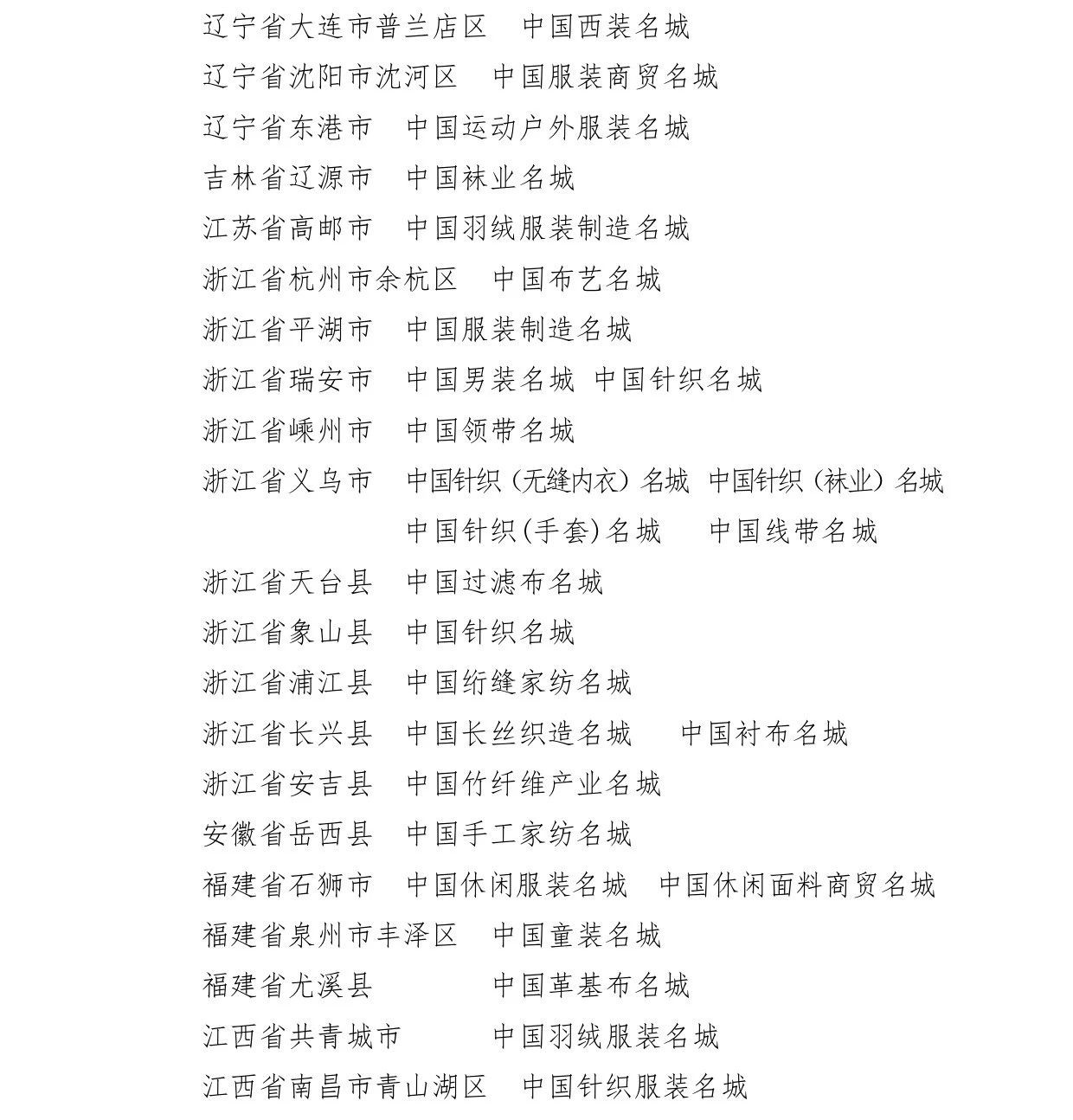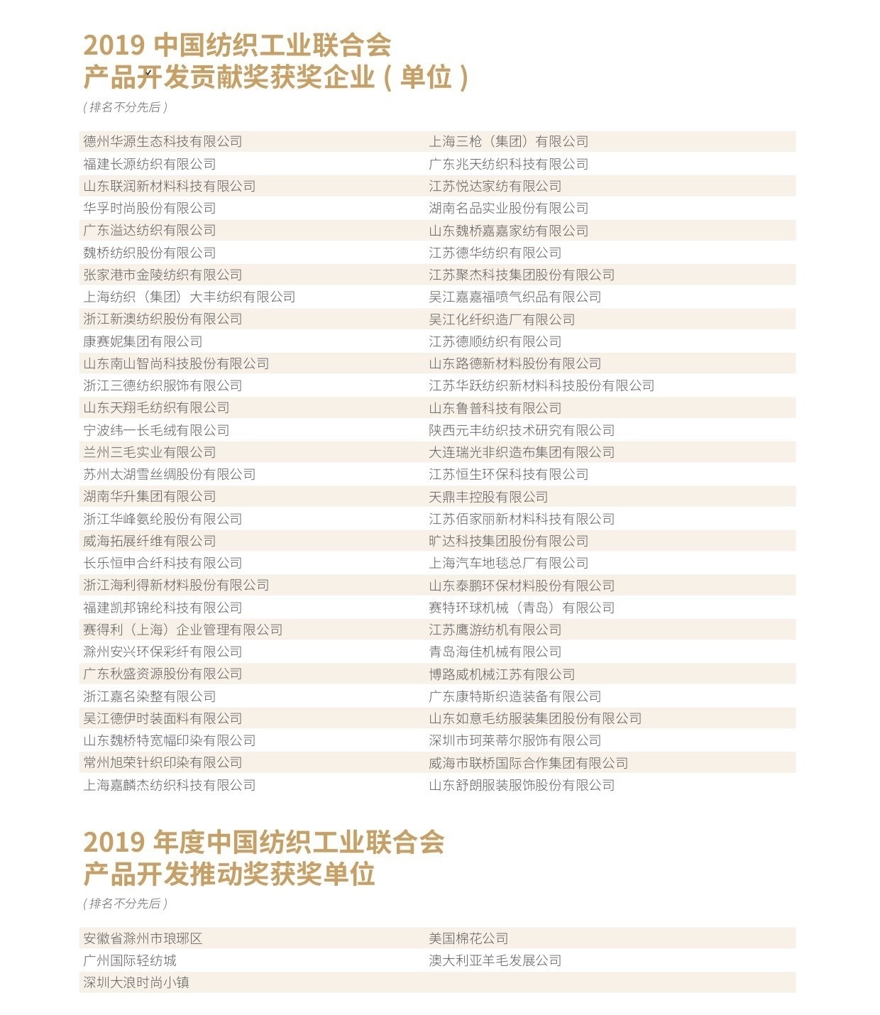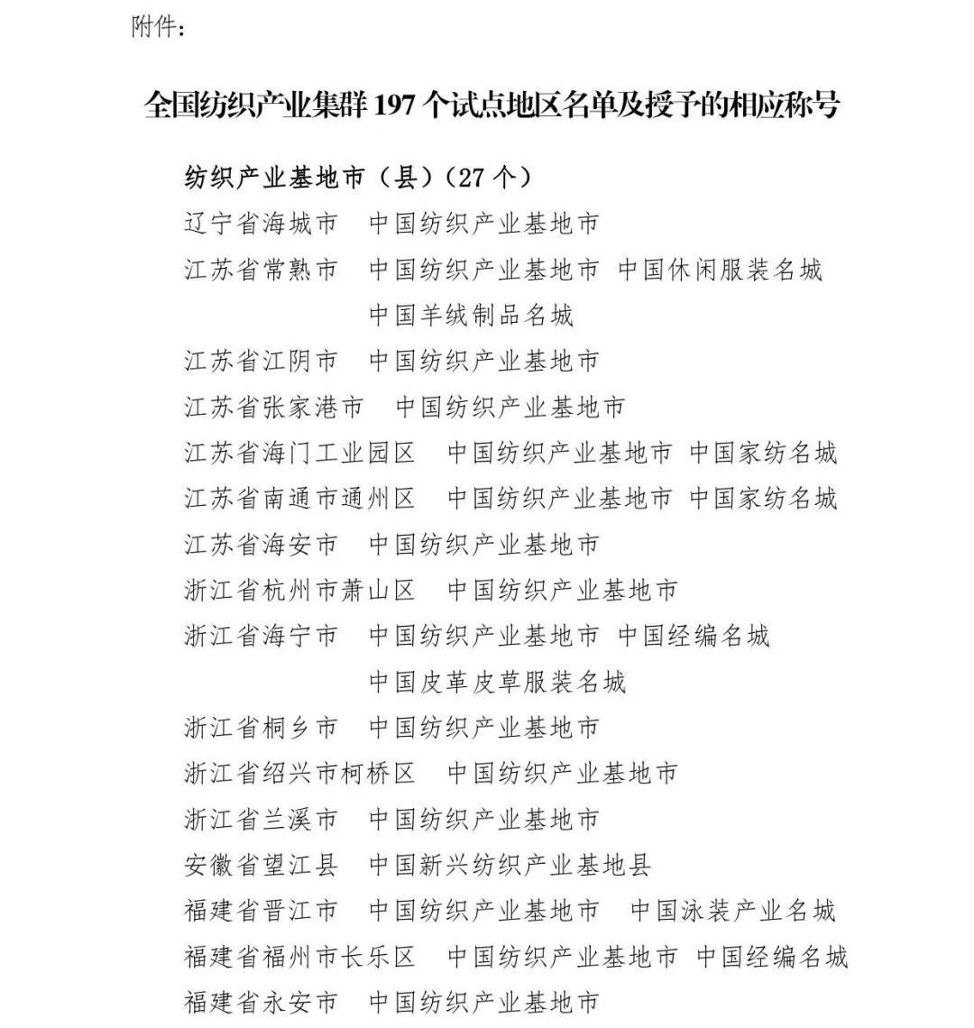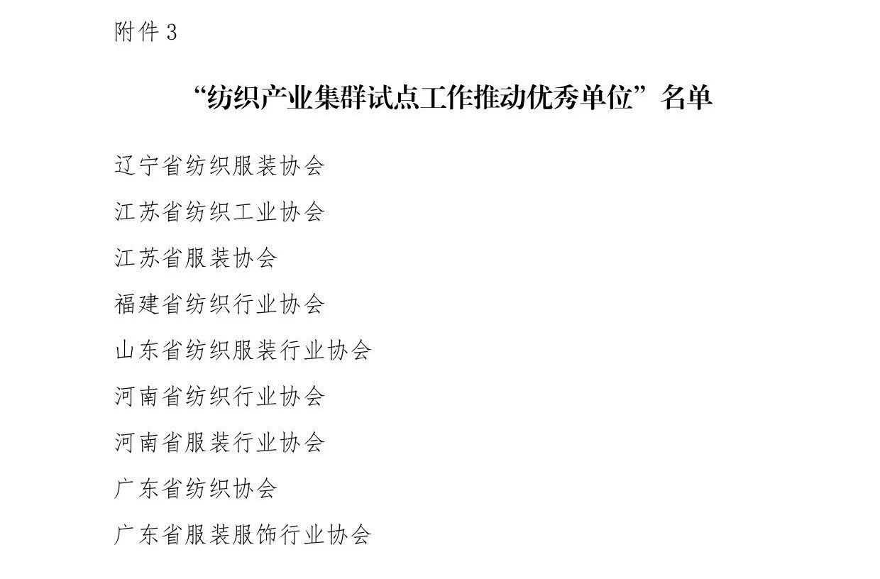 會(huì)議還為遼寧省海城市等197個(gè)紡織產(chǎn)業(yè)集群試點(diǎn)地區(qū)授牌。確定山東省昌樂(lè)縣等七個(gè)地區(qū)為紡織產(chǎn)業(yè)集群試點(diǎn)地區(qū)并授牌。頒發(fā)“集群地區(qū)紡織產(chǎn)業(yè)發(fā)展服務(wù)優(yōu)秀單位獎(jiǎng)”、“紡織產(chǎn)業(yè)集群試點(diǎn)工作推動(dòng)優(yōu)秀單位獎(jiǎng)”。頒發(fā)“第八屆全國(guó)紡織行業(yè)管理創(chuàng)新成果獎(jiǎng)”。頒發(fā)“2019年度十大類紡織創(chuàng)新產(chǎn)品獎(jiǎng)”。頒發(fā)“2019年度中國(guó)紡織工業(yè)聯(lián)合會(huì)產(chǎn)品開(kāi)發(fā)貢獻(xiàn)獎(jiǎng)”。