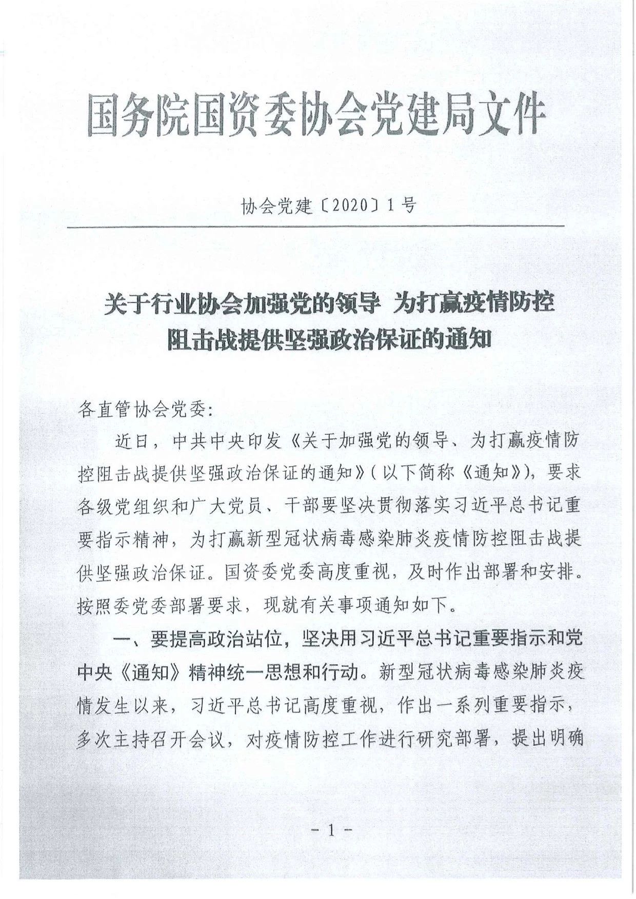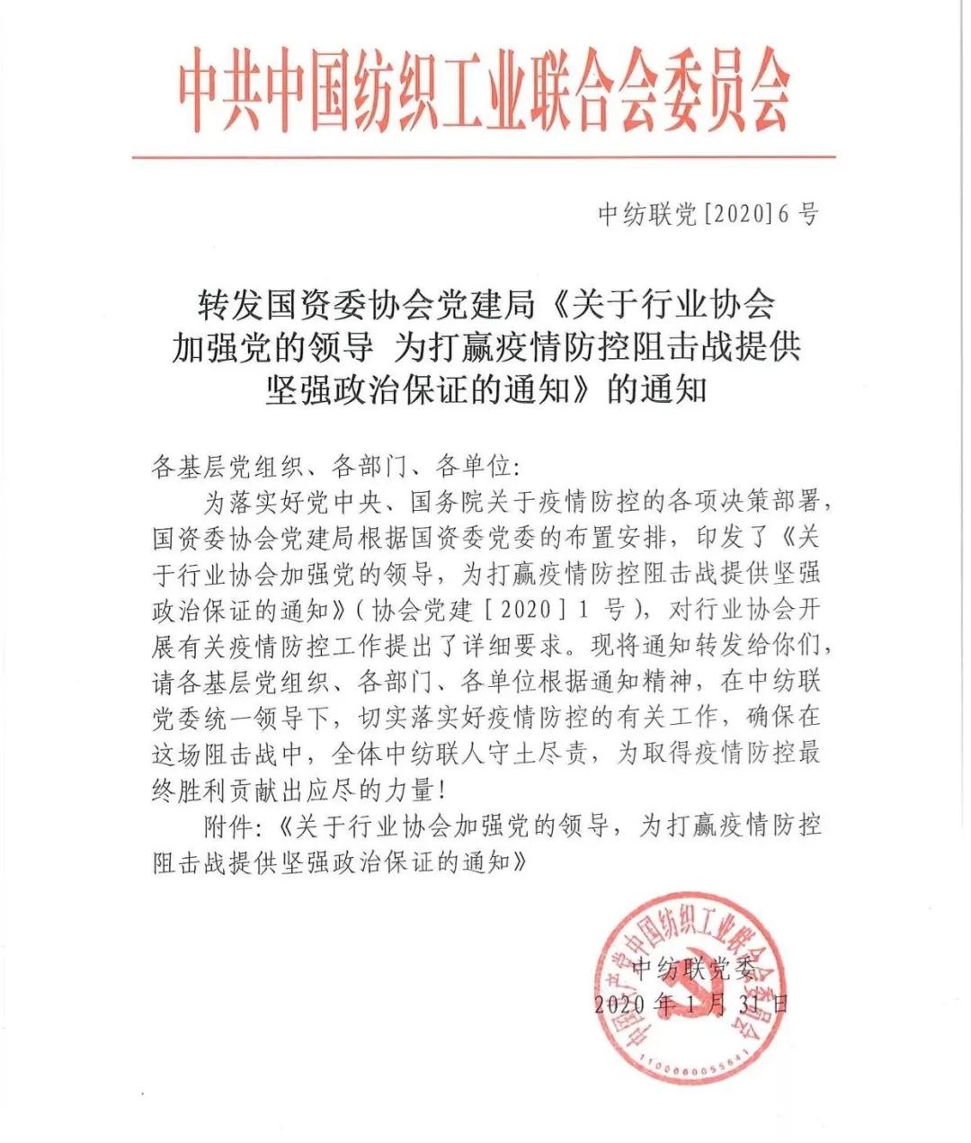 為落實好黨中央、國務院關于疫情防控的各項決策部署,國資委協會黨建局根據國資委黨委的布置安排,印發了《關于行業協會加強黨的領導,為打贏疫情防控阻擊戰提供堅強政治保證的通知》(協會黨建[2020]1號),對行業協會開展有關疫情防控工作提出了詳細要求。中國紡織工業聯合會黨委現將通知轉發,請各基層黨組織、各部門、各單位根據通知精神,在中紡聯黨委統一領導下,切實落實好疫情防控的有關工作,確保在這場阻擊戰中,全體中紡聯人守土盡責,為取得疫情防控最終勝利貢獻出應盡的力量。