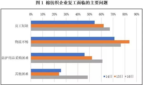 中棉行協專門成立了防控疫情,恢復生產協調小組,并開通了中國棉紡織行業協會在線服務平臺收集企業在抗擊疫情、恢復生產中遇到的問題和建議。2月16日,共有10家企業(累計25家)反饋,除了圖1中列出的問題,棉紡織企業還面臨因下游產業鏈開工不足導致訂單不足,而不得部分或暫緩開工;與此同時,隨著時間推移,資金鏈緊張、社保和還貸壓力大等金融方面的問題愈加凸顯。根據上述問題,中棉行協高度重視,并即時向上級部門匯報,持續貫徹落實中央“突出重點、統籌兼顧、分類指導、分區施策”的防控要求,積極協調與服務好企業疫情防控、復工復產工作。