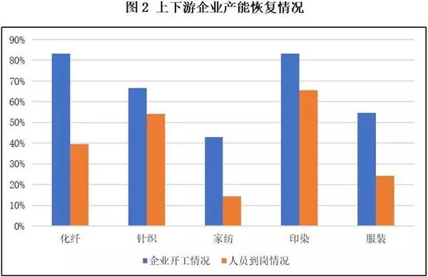 從所調查上下游企業樣本看產能恢復情況,各行業復工企業和復工人員占比如圖2所示,整體來看,人員到崗情況稍弱于企業開工情況,說明企業正挖掘潛力提高開工率。綜合看這兩方面數據,上下游產業與棉紡織產業產能恢復情況基本相當;化纖企業開工情況較好,說明原料供應充足;印染行業依舊保持較高活力,在兩方面指數均有較高優勢。