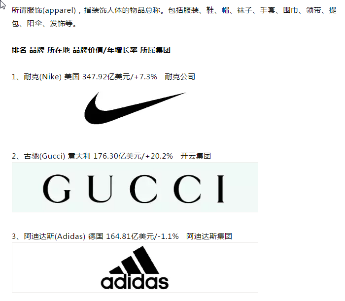 英國品牌評估機構“品牌金融”(Brand Finance)發布“2020全球最有價值的50個服飾品牌”排行榜(Brand Finance Apparel 50 2020)。運動品牌耐克蟬聯第一名,奢侈品牌古馳躍居第二位,運動品牌阿迪達斯名列第三位。中國香港珠寶品牌周大福升至第15位,中國運動品牌安踏升至第18位。
