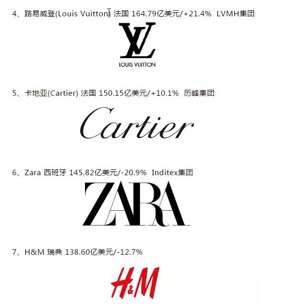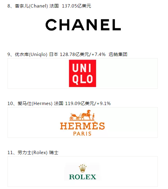 上榜的50大服飾品牌的總價值為3008億美元。其中,美國品牌總價值927億美元,占比30.8%;法國品牌總價值700億美元,占比23.3%;意大利品牌總價值338億美元,占比11.2%;德國品牌總價值217億美元,占比7.2%;西班牙品牌總價值162億美元,占比6.4%;瑞士品牌總價值156億美元,占比5.2%。