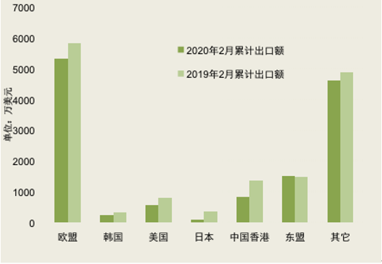 圖 2020年1~2月羊絨產品主要出口地區出口情況