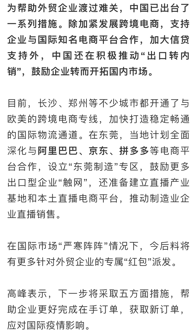 高峰透露,從近期商務部對重點省市、各進出口商會和重點企業摸底調研情況來看,外貿企業依然面臨在手訂單取消或延期、新訂單簽約困難、物流不暢等諸多困難。