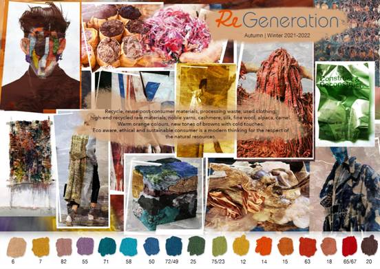 該主題講述了高端原材料、紗線,例如羊絨、真絲、超細羊毛、羊駝毛和駱駝毛等的回收再利用的概念。對生產過程中產生的廢料、消費前、消費后材料(舊衣服)的回收再生。顏色圍繞暖桔色調,新的冷光棕色展開,F代人們對環境、道德以及可持續的思考體現了對自然資源的極大尊重。