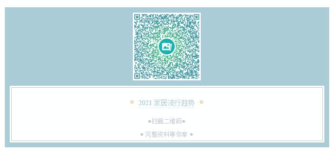 以上是“2021家居流行趨勢”的內容,希望如同這個夏季的一縷清風,一掃夏季的悶熱,為你帶來撥開迷霧。如果你希望看到完整版的“2021家居流行趨勢”,請掃描以下二維碼,獲取手冊!