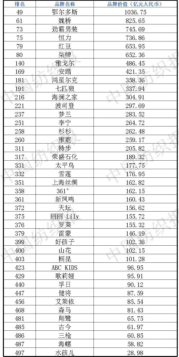 盡管新冠疫情沒有阻擋中國品牌價值整體上升的趨勢,但是與去年相比,服裝、汽車、旅游、媒體等受疫情影響大的行業入榜品牌數量明顯下降,而食品飲料、金融、機械等“剛需“行業入榜品牌均有不同程度增加。本年度《中國500最具價值品牌》排行榜中,共有來自食品飲料、輕工業、建材、傳媒、紡織服裝、醫藥、機械等在內的27個相關行業的品牌入選。其中,紡織服裝行業入選品牌共41個。本年度共有53個中國品牌的價值超過1000億,比去年增加了6個。