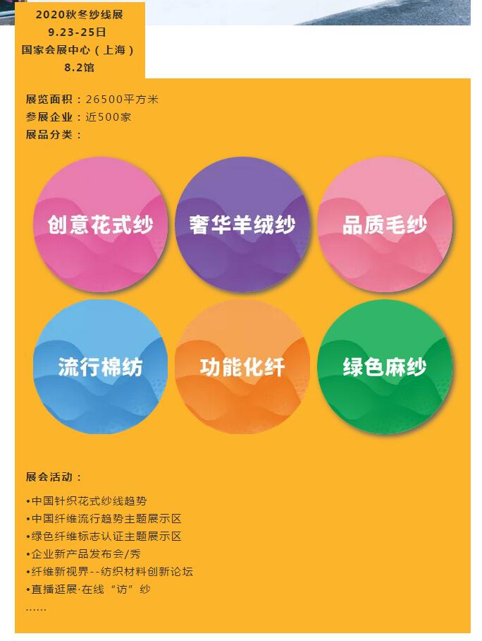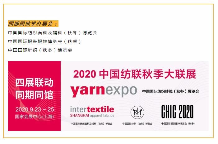 2020yarnexpo秋冬紗線展作為本年度中國紡聯旗下展會的收官之戰,也是決定纖維紗線行業能否贏取2020年度下半場的收官之戰。屆時,纖維紗線展商將"各顯神通",推出抗菌、抗病毒、吸濕排汗、再生環保、阻燃抗紫外、遠紅外、抗靜電等功能性產品,借助一站式接軌下游市場的平臺優勢,努力將"金九銀十"推向高潮,孕育行業破云而出的源頭之光。