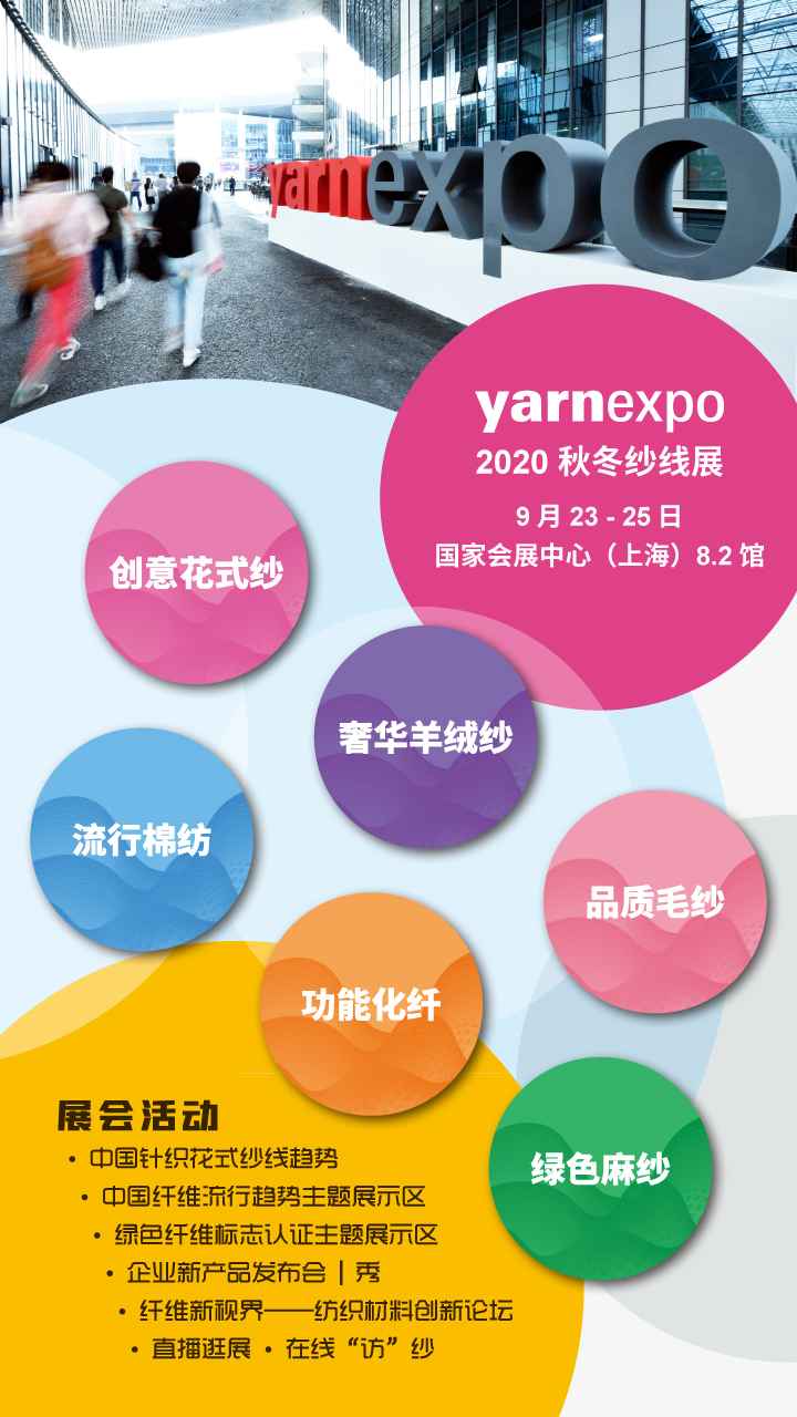 第十七屆yarnexpo秋冬紗線展將于2020年9月23-25日在國家會展中心(上海)8.2館,與下游、終端展會中國國際紡織面料及輔料(秋冬)博覽會、中國國際服裝服飾博覽會(秋季)和中國國際針織(秋冬)博覽會同期同地舉辦。產業上下游品牌展會聯展,一站式商貿、自帶觀眾流量、暢通產業雙循環和展會影響力優勢疊加,市場和發展機會難得。