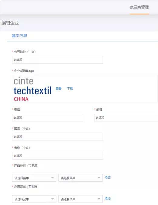 點擊“參展商管理”填寫企業(yè)信息,企業(yè)logo點擊可更換,產(chǎn)品類別、應(yīng)用領(lǐng)域、展商類別可多選、中英公司簡介、產(chǎn)品簡介,限150字,超出內(nèi)容無法顯示;