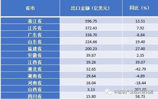 前三季度紡織品服裝部分省市出口情況表