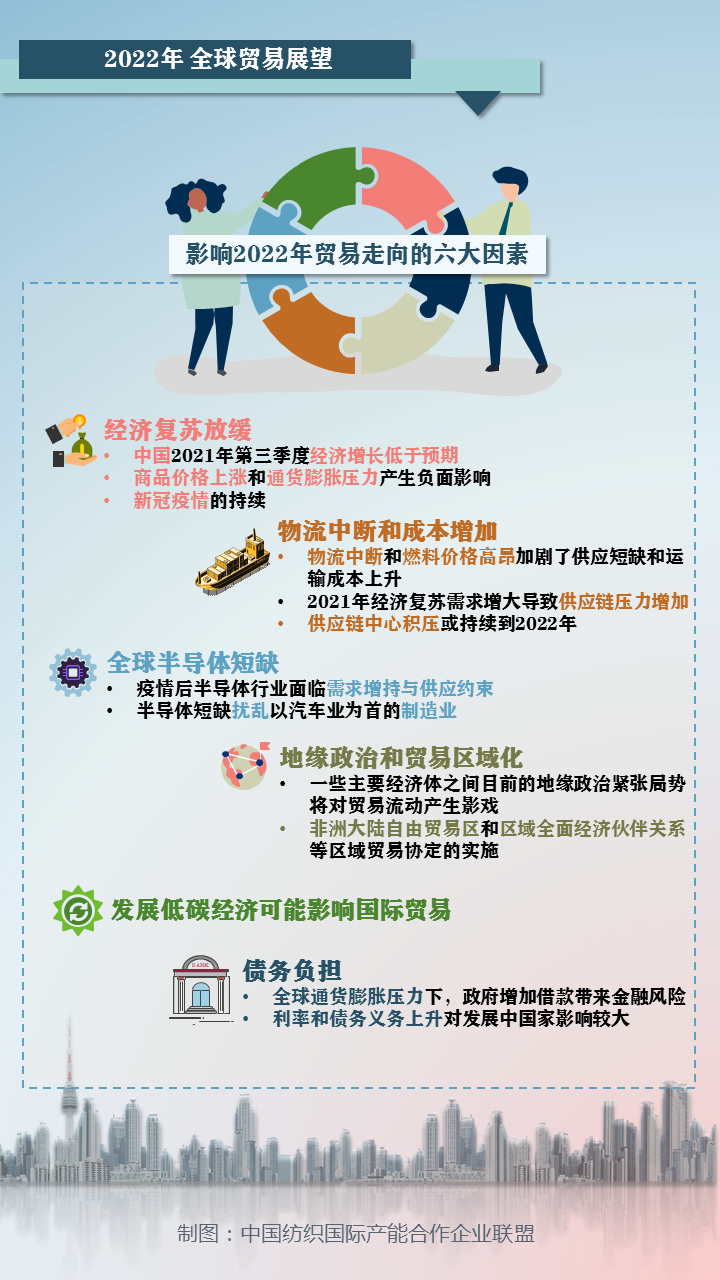 UNCTAD展望2022年,認(rèn)為經(jīng)濟(jì)復(fù)蘇放緩、物流中斷和成本增加、全球半導(dǎo)體短缺、地緣政治和貿(mào)易區(qū)域化、發(fā)展低碳經(jīng)濟(jì)和債務(wù)負(fù)擔(dān)將成為影響2022年全球貿(mào)易走向的六大因素。