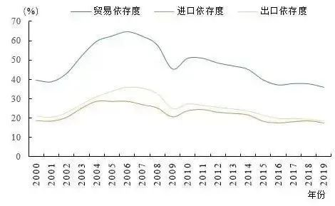在整體層面,貿(mào)易依存度可用于評價中國產(chǎn)業(yè)鏈對外部需求和供給的依賴,從而大致表明外循環(huán)在中國產(chǎn)業(yè)鏈中的地位現(xiàn)狀。此處的貿(mào)易依存度用貿(mào)易總額與GDP的比重來定義,可以進一步分為進口依存度和出口依存度。總體上,2000~2019年,中國產(chǎn)業(yè)鏈的外循環(huán)地位大致經(jīng)歷了先迅速上升,隨后波動下降的趨勢。具體地,2001~2006年,中國加入WTO后貿(mào)易依存度迅速上升,在2006年達到最高點(64.48%);2007~2009年,貿(mào)易依存度開始下降,并在金融危機的影響下下降速度較快;2010~2019年,隨著全球經(jīng)濟的恢復,貿(mào)易依存度有短暫的上升,之后穩(wěn)步下降,2019年依存度為35.68%,并且2019年外循環(huán)地位已經(jīng)不及2000年。出口依存度和進口依存度也表現(xiàn)出與貿(mào)易依存度相類似的變化趨勢,這意味著中國產(chǎn)業(yè)鏈已經(jīng)轉(zhuǎn)變?yōu)橛蓛?nèi)循環(huán)主導(見圖1)。