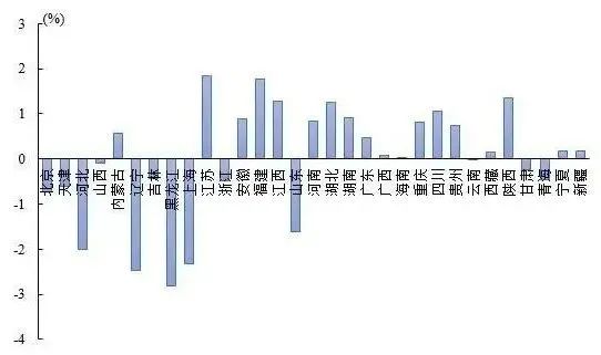 中國第二產(chǎn)業(yè)主要集中在東部沿海和中部省份,東部各省的占比在增加,產(chǎn)業(yè)有向中部和西南轉(zhuǎn)移的微弱趨勢。從圖4可以看到,江蘇和廣東的第二產(chǎn)業(yè)占全國第二產(chǎn)業(yè)的比重最大,分別達到了11.54%、11.34%,東部的浙江、安徽、福建、江西、山東,中部的河南、湖北、湖南,以及西南的四川占比也相對較高。從1998~2020年各省第二產(chǎn)業(yè)占全國第二產(chǎn)業(yè)比重的變動來看(見圖5),華北的北京、河北、天津、山西,以及東北下降趨勢較為明顯;東部的江蘇、安徽、福建、江西,中部的河南、湖北、湖南,西南的四川、重慶、貴州,西北的陜西上升趨勢較為明顯。