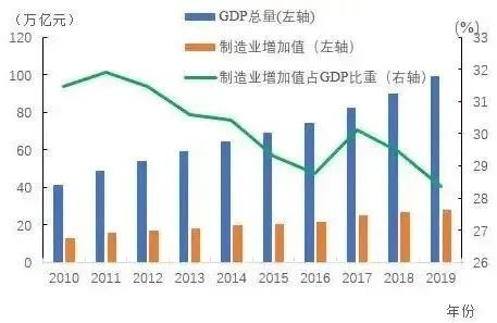 目前,我國制造業(yè)發(fā)展取得了顯著的成效,但制造業(yè)比重呈現(xiàn)下降趨勢。從圖6可以看出,我國制造業(yè)總體規(guī)模從2010年穩(wěn)步提升,2010年制造業(yè)增加值為13.00萬億元,到2019年增加至的28.10億萬元,實現(xiàn)絕對數(shù)量上的翻一番;但是在GDP占比呈下降趨勢,從2011年峰值31.90%降至2019年28.4%,基本維持在28.00%以上。