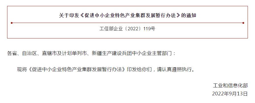 為進一步做好促進中小企業特色產業集群發展工作,推動中小企業高質量發展,工業和信息化部近日印發《促進中小企業特色產業集群發展暫行辦法》。《辦法》正文共五章,第一章總則,明確中小企業特色產業集群促進工作的依據、定義、原則和職責分工。第二章培育要求,提出培育方向和落實措施要求。第三章認定程序,對申報、初審、復審和認定流程作出規定。第四章動態管理,明確認定有效期、日常監督考核、期滿復核、撤銷認定情形等內容。第五章附則,明確發布主體及發布實施日期。附件規定集群的認定標準,須滿足具有較強核心競爭力、優質中小企業梯度培育成效顯著、產業鏈供應鏈協作高效、協同創新能力較強、數字化轉型效果明顯、綠色化發展水平較高、開展高水平開放合作、治理和服務能力較強等八方面的要求。本辦法自2022年9月13日起實施。