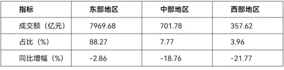 從區域結構看,1-9月,46家重點監測市場中,東部地區專業市場成交額為7969.68億元,同比下降2.86%,占到專業市場總成交額的88.27%;中部地區專業市場成交額為701.78億元,同比下降18.76%,占到專業市場總成交額的7.77%;西部地區專業市場成交額為357.62億元,同比下降21.77%,占到專業市場總成交額的3.96%。