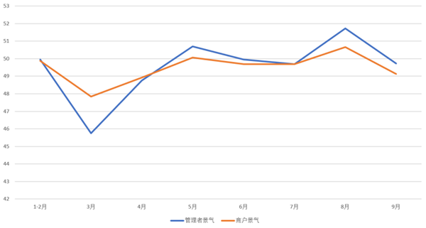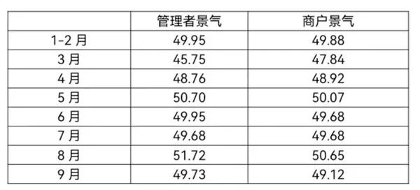 景氣方面,2022年1-9月,紡織服裝專業市場管理者景氣與商戶景氣走勢基本一致。管理者景氣平均指數為49.53,商戶景氣平均指數為49.48,均低于50榮枯線;1-9月專業市場運管理者與商戶整體信心不足,景氣指數偏低。
