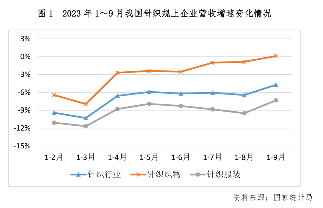 行業營收,較今年上半年略有好轉。1~9月針織行業規上企業主營業務收入同比下降4.72%,降幅較上半年收窄1.47個百分點。其中,針織織物規上企業營業收入同比微增0.11%,較上半年提高2.63個百分點;針織服裝規上企業營業收入同比下降7.33%,降幅較上半年收窄0.95個百分點。
