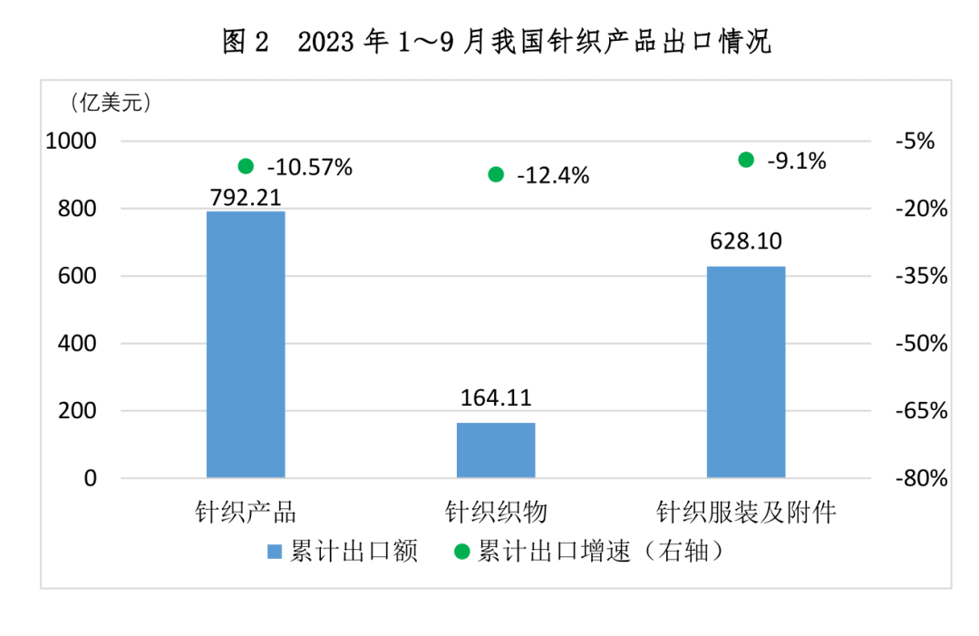 1~9月,我國針織產品出口792.21億美元,同比下降10.57%,降幅較上半年擴大0.32個百分點。其中,針織織物出口164.11億美元,同比下降12.4%;針織服裝及附件出口628.10億美元,同比下降9.1%。9月當月,我國針織產品出口同比下降3.54%,環比降幅大幅收窄。