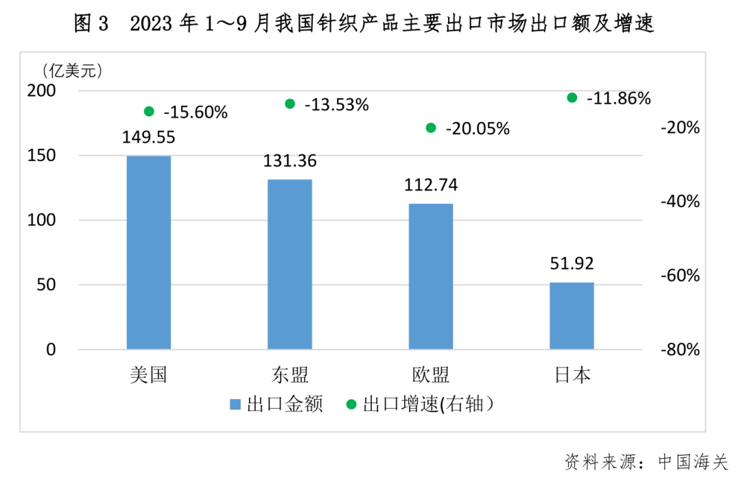 從主要出口市場來看,我國針織產品對幾大出口目的國的出口額依舊保持收縮態勢,降幅與上半年基本持平。