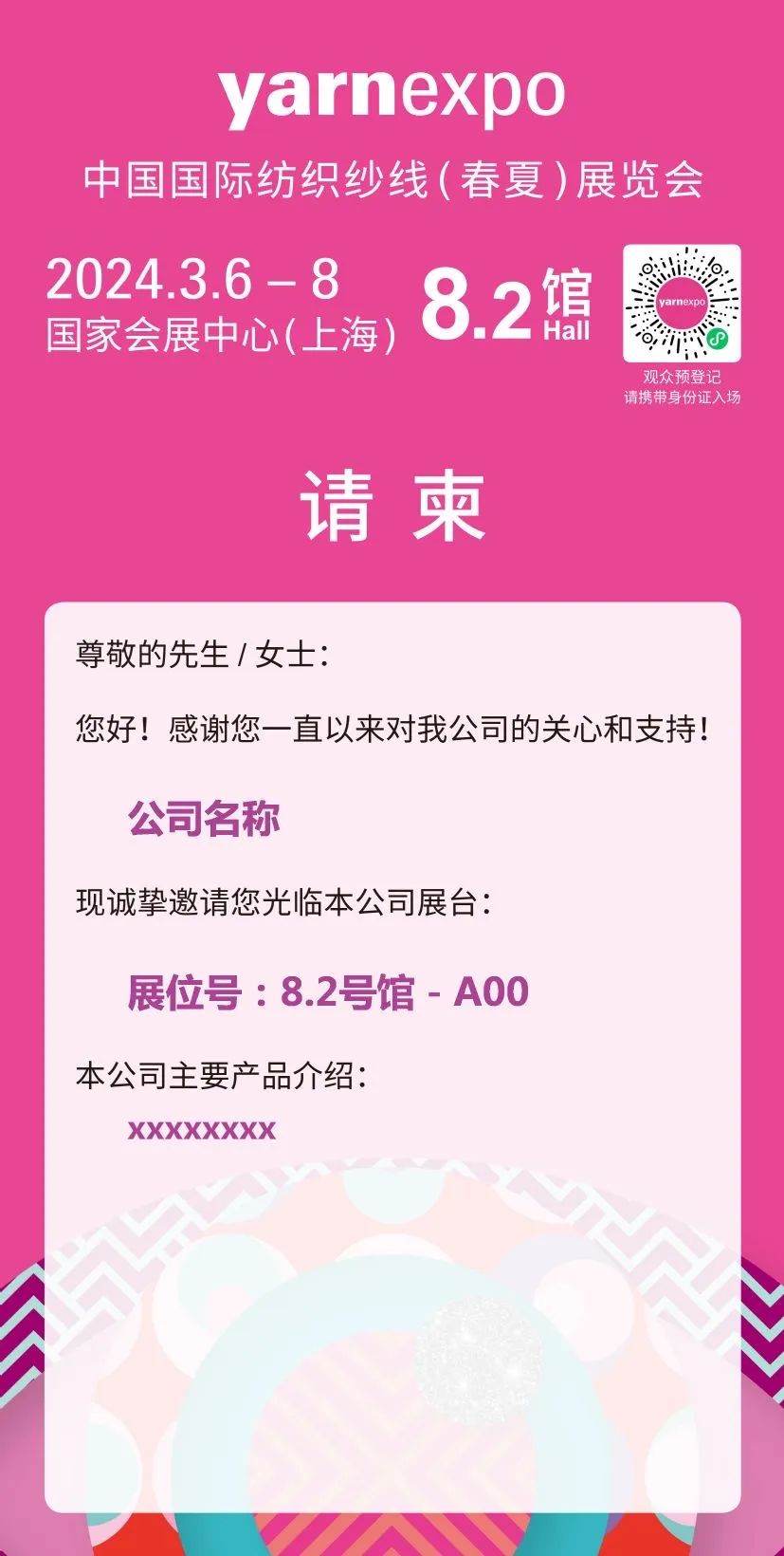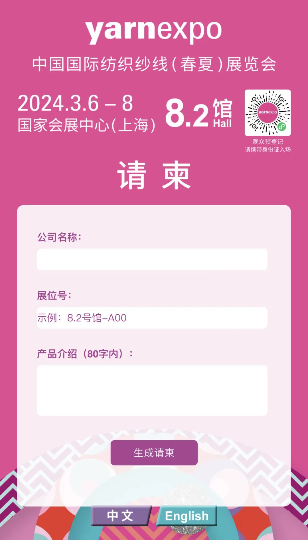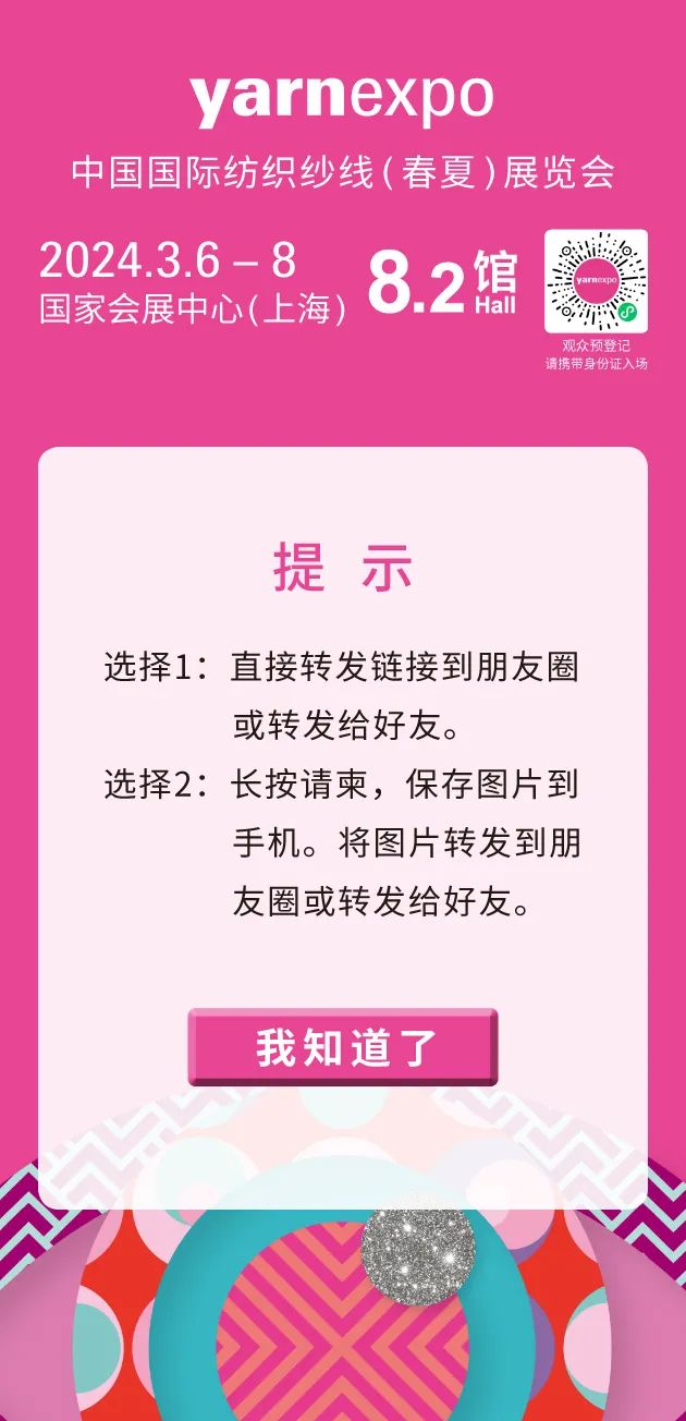 您現在的位置是:首頁 > 要聞 2024yarnexpo春夏紗線展 | 展商專屬客戶請柬 全新升級版來啦~~~ 來源:yarnexpo紗線展 發布日期:2024-02-26 字體: 【小】 【中】 【大】 全新中英雙語版展商專屬定制請柬 只需簡單幾步 直達客戶手中~~ 掃描二維碼進入專屬請柬頁面 重 要 提 示 請提醒您的客戶務必于觀展前至少一天完成預約登記, 并嚴格按照預約日期,攜帶有效證件入場。 若未預約,則只能登記次日入場。 1. 按要求填寫公司名稱及展位號、產品介紹等相關信息,點擊“ 生成請柬 ”按鈕。 2. 點擊“我知道了”按鈕,成生請柬。長按生成頁面保存圖片轉發,或直接轉發至朋友圈。 觀眾預登記 掃碼微信小程序 2024.3.6-8 yarnexpo春夏紗線展 國家會展中心(上海)8.2館 熱門文章: 聚力專精特新 共筑產業未來—2026中國紡聯春季聯展【紡織專... [2026-02-05] 鏈接全球家紡商機,2026intertextile秋冬展展位... [2026-02-04] 數讀2025 | 盤點全年中國紡織行業對外貿易表現 [2026-02-03] 以改革創新精神將社會工作各項決策部署落實到位--與會代表深入... [2026-01-28] 鏈接全球紡業,共啟“十五五”新篇--2026年紡織貿促會邀您... [2026-01-27] 展會直通車