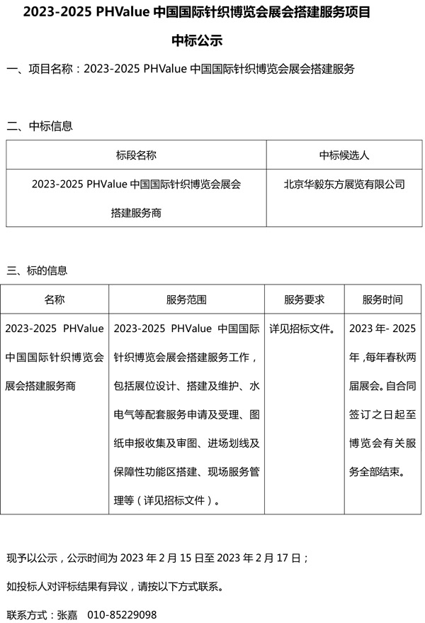 2023-2025 PHValue中國國際針織博覽會展會搭建服務項目中標公示